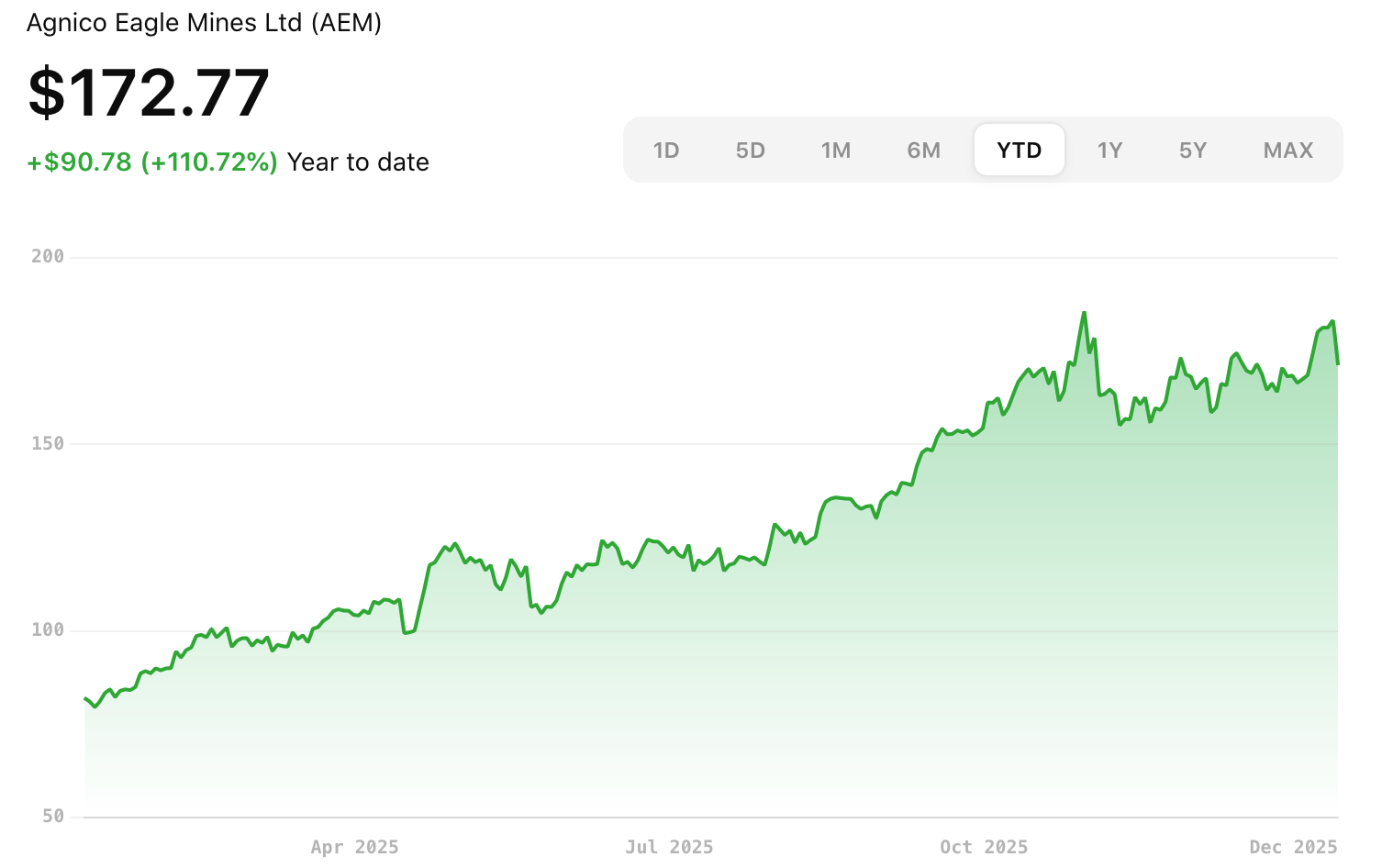 The quiet assassin. Agnico’s premier Canadian and Nordic assets gave investors pure leverage to gold without jurisdictional drama. Institutions flooded in.