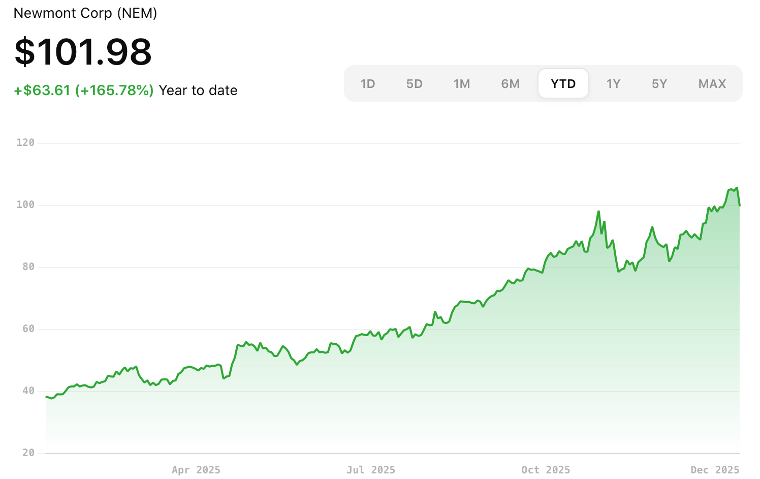 World’s largest gold miner. Years of consolidation finally paid off. Cash flow exploded as gold broke above $3,000, then $4,000, turning Newmont into a dividend-printing machine.