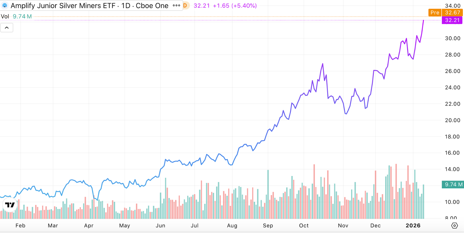 Silver hasn’t just rallied — it’s accelerated. And in that environment, the ETF for silver miners Amplify Junior Silver Miners (SILJ) is often the leverage play that multiply the underlying metal’s gains.